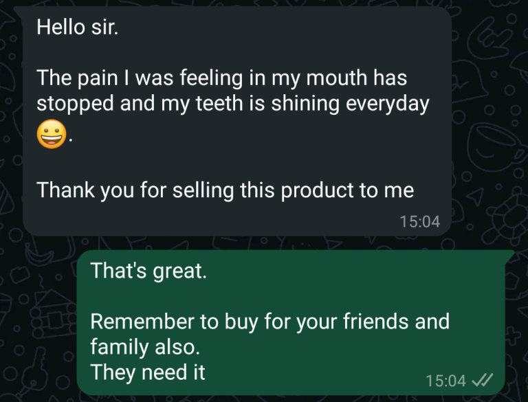For about a year, anytime i brush my teeth, blood will drop from my mouth. This was happening at least 3 times every weak. Even when i am eating, i will feel pains in my mouth. 2 months ago, i saw an advert about this product and decided to buy it. After using it for 2weeks, i stopped seing blood in my mouth and all the pains stopped.